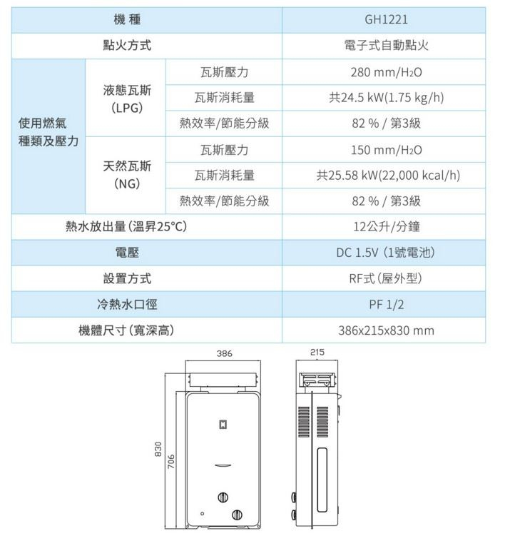 SAKURA 櫻花牌 GH-1221 12L屋外抗風型ABS防空燒熱水器