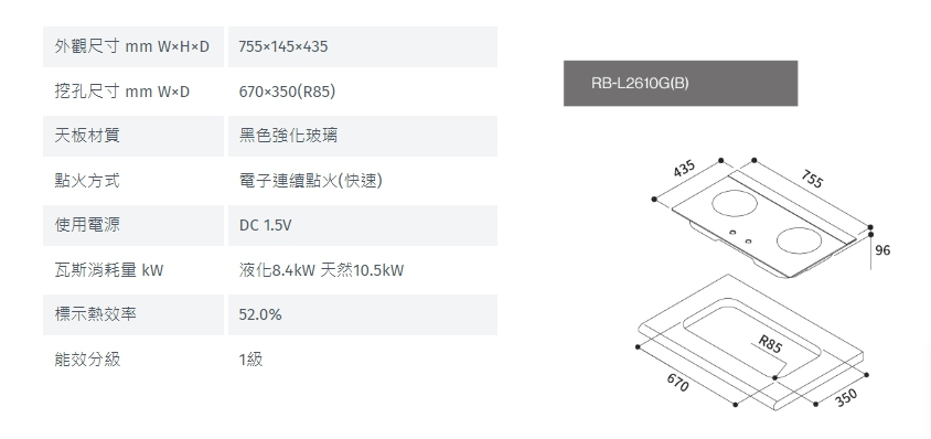 林內 Rinnai RB-L2610G(B) 檯面式彩焱玻璃雙口爐