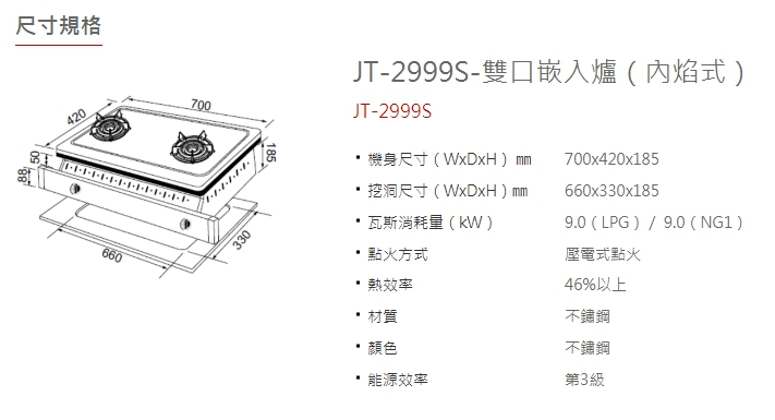 喜特麗 喜特麗 JT-2999S 高效節能內焰崁入式瓦斯爐