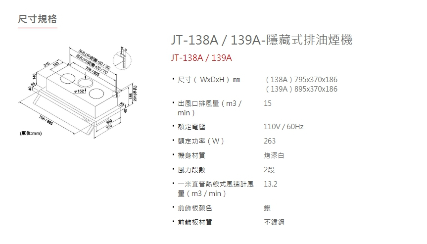 喜特麗 JT-138A/139A-隱藏式排油煙機