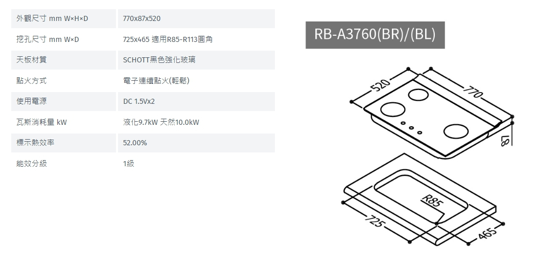 林內 Rinnai RB-A3760G(BL) 檯面式緻溫玻璃三口爐