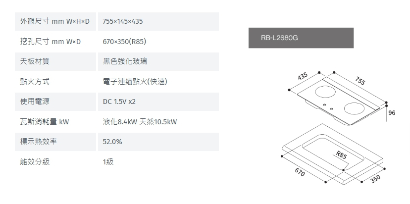 林內 Rinnai RB-L2680G(B) 檯面式彩焱玻璃雙口爐
