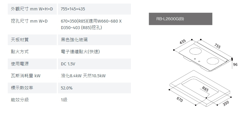 林內 Rinnai RB-L2600G(B) 檯面式彩焱玻璃雙口爐