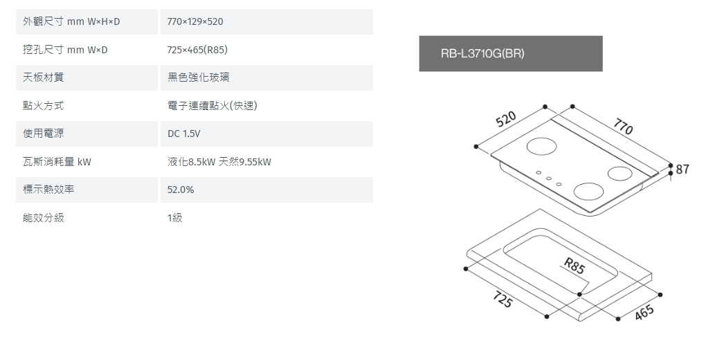 林內 Rinnai RB-L3710G(BR) 檯面式彩焱玻璃三口爐