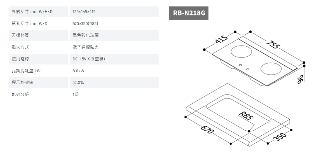 林內 Rinnai RB-N218G(B) 檯面式內焰玻璃雙口爐