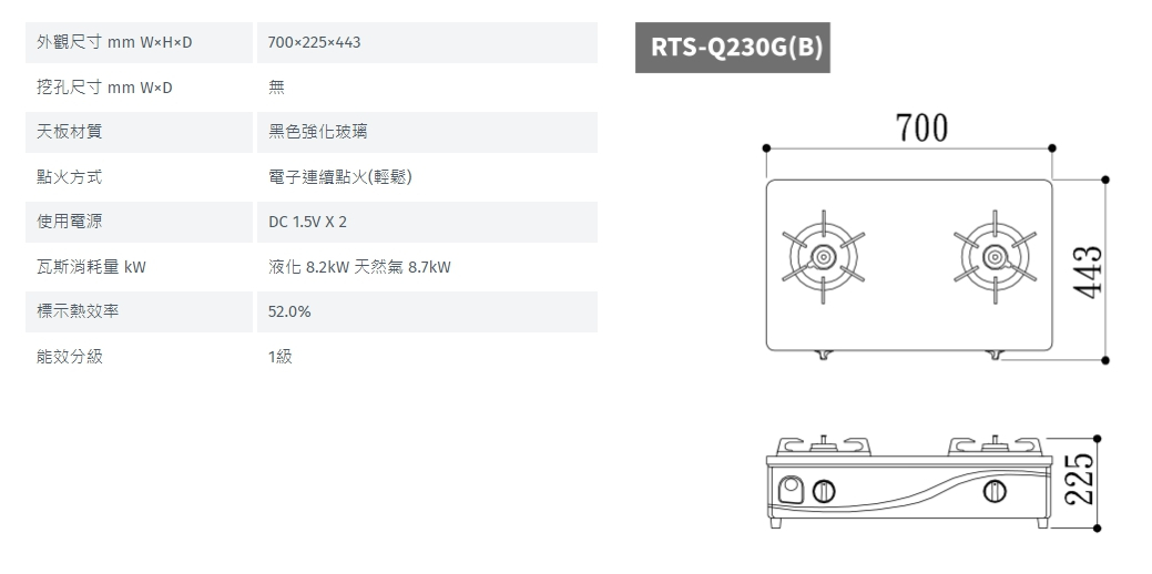 林內 Rinnai RTS-Q230G(B) 台爐式感溫玻璃雙口爐