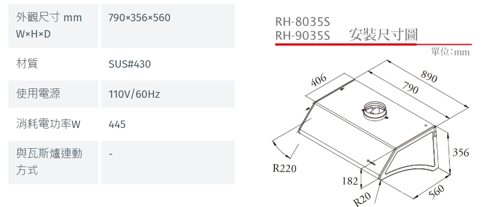 林內 Rinnai RH-8035S 深罩式高速馬達排油煙機