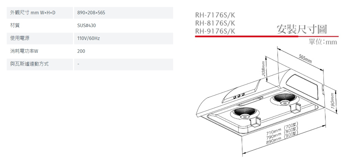 林內 Rinnai RH-9176S 圓弧式典雅輕巧排油煙機