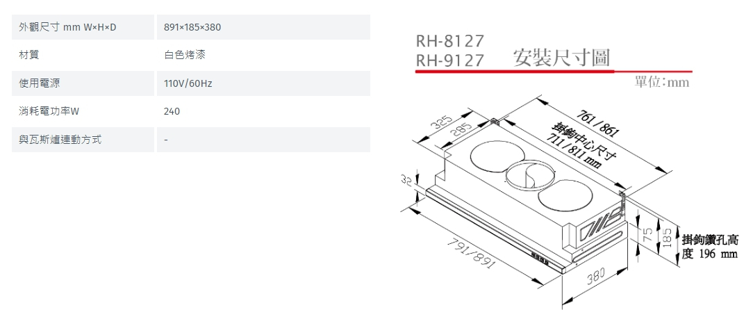 林內 Rinnai RH-9127 隱藏式超薄設計電熱除油排油煙機